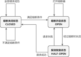 如果熔断器是开启状态,则先判断熔断器的熔断时间是否超过上限,如果是则将熔断器的状态从全开改为半开。如果改为了半开后,则先放行该请求,如果该请求还是发生了错误,则又改为全开状态。那什么时候从关闭状态到全开状态呢?这就要看具体的实现类了。